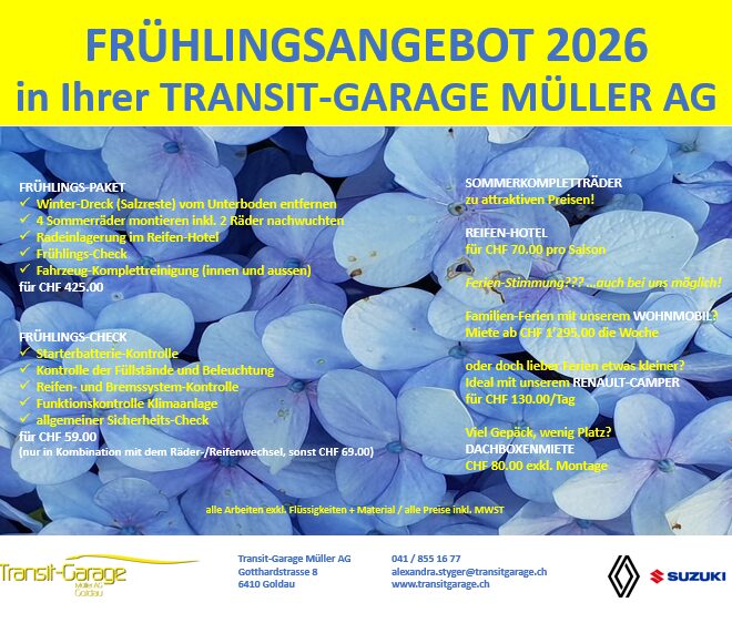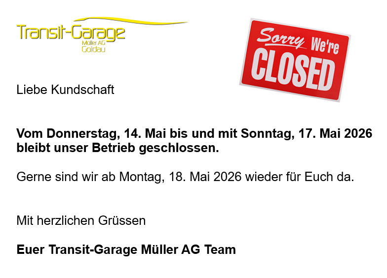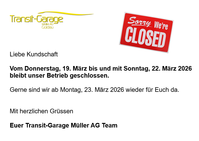 Liebe Kundschaft Auf Voranmeldung öffnen wir Ihnen gerne die Tür. (10.00 Uhr bis 13.00 Uhr) Für Ihr Verständnis herzlichen Dank Ihre Transit-Garage Müller AG